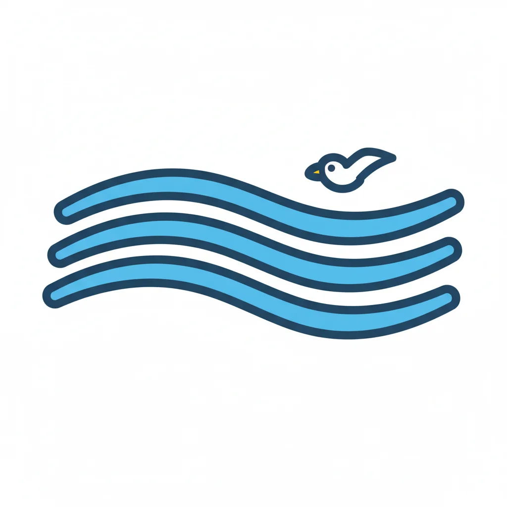 Minimalistische Darstellung von blauen Wellen und einem fliegenden Vogel.