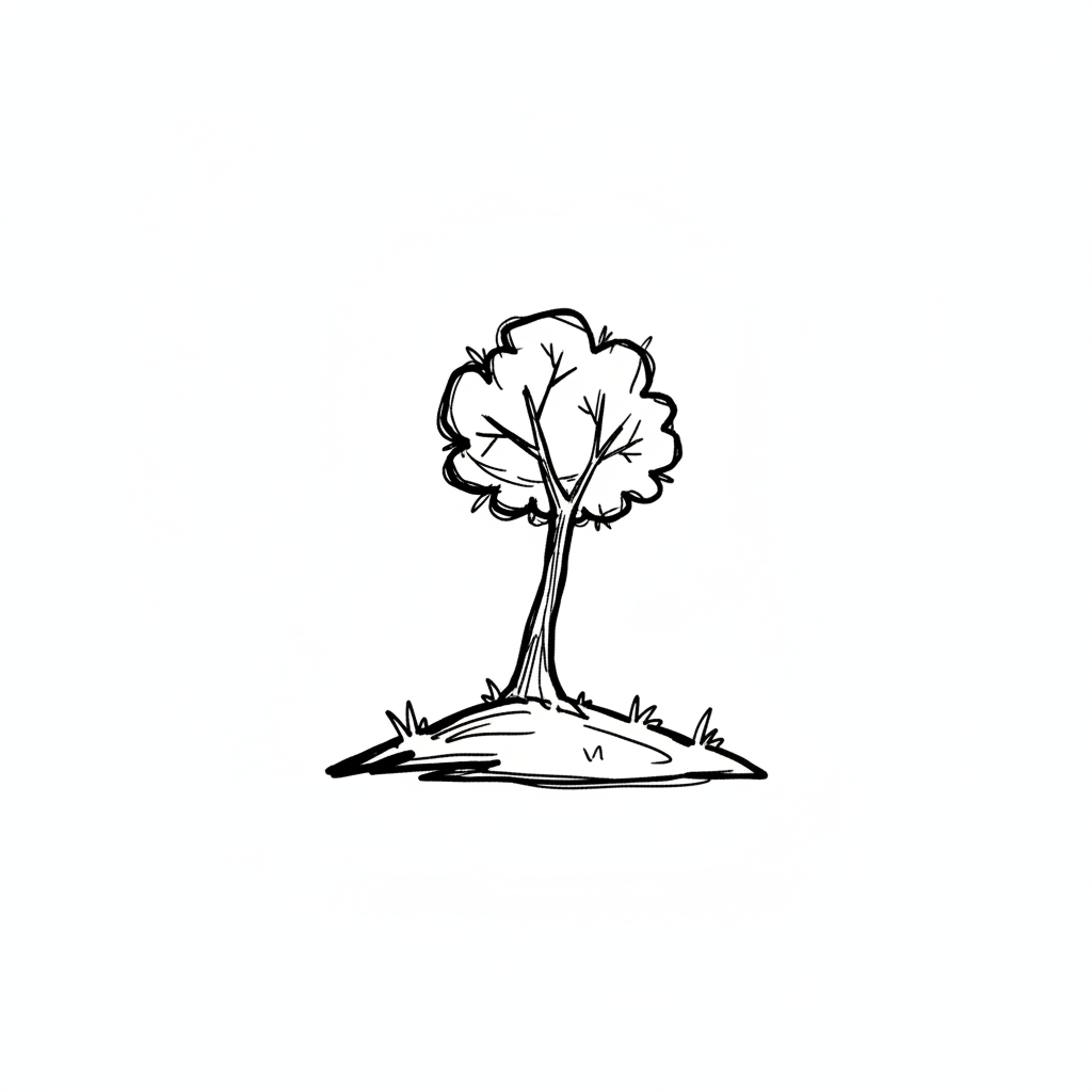 Handgezeichnete Skizze eines Baumes auf einem kleinen Hügel mit Gras.