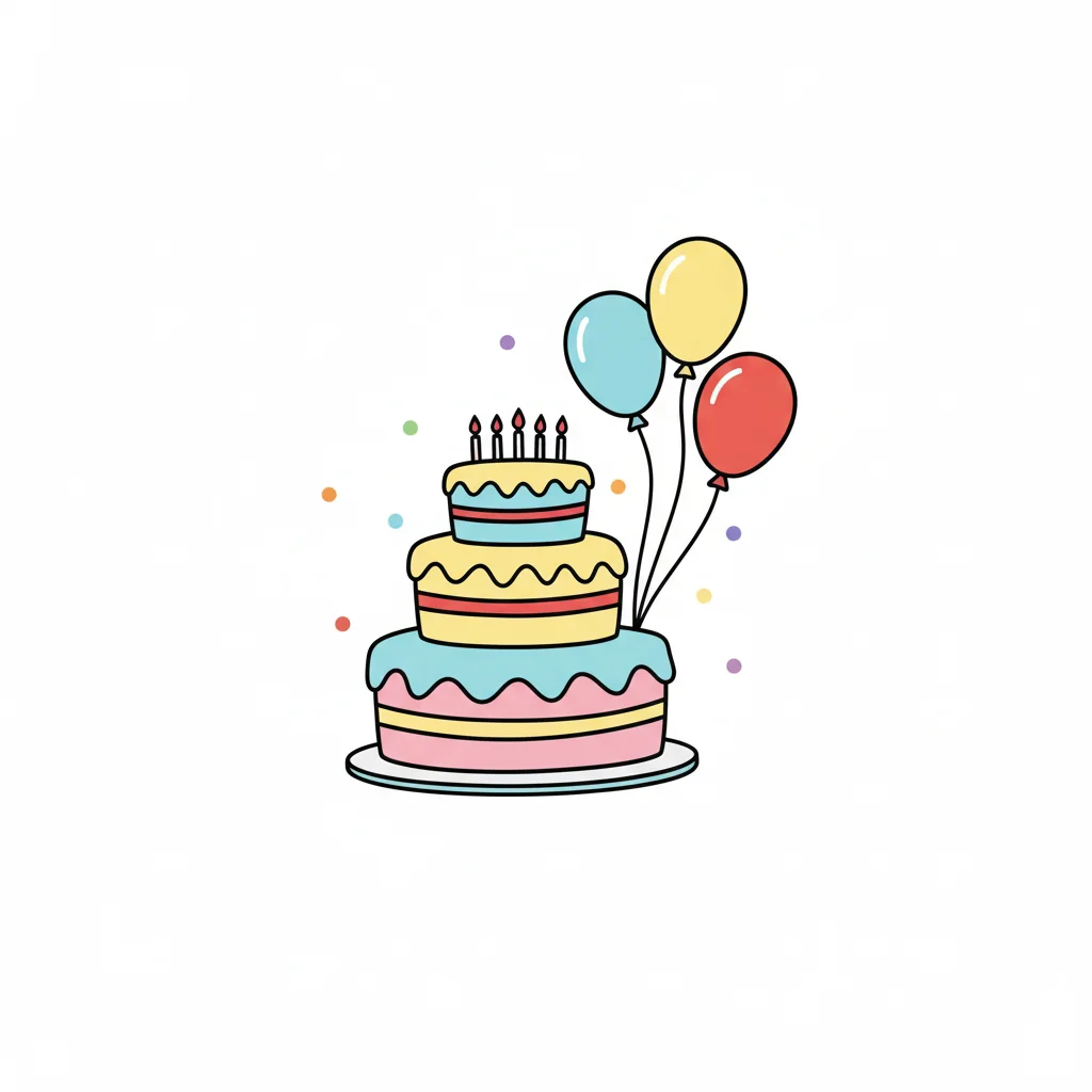 Bunter Geburtstagskuchen mit Luftballons und Konfetti.