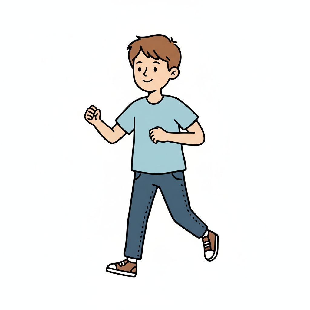 Minimalistische, handgzeichnete Illustration mit deutlich handgezeichneter Wirkung. Handgezeichnete Schwarze Konturen ungleichmäßig und unregelmäßig von Hand gezeichnet. Figuren werden mit stark vereinfachten Körperformen dargestellt. Arme und Beine sind nur als einfache Linien oder Strichformen angedeutet. Flächige Farben ohne Verläufe oder Texturen, ruhige harmonische Farbpalette und reduzierte Details sorgen für eine klare, kindgerechte Darstellung. Saubere, übersichtliche Komposition mit rein weißem Hintergrund.