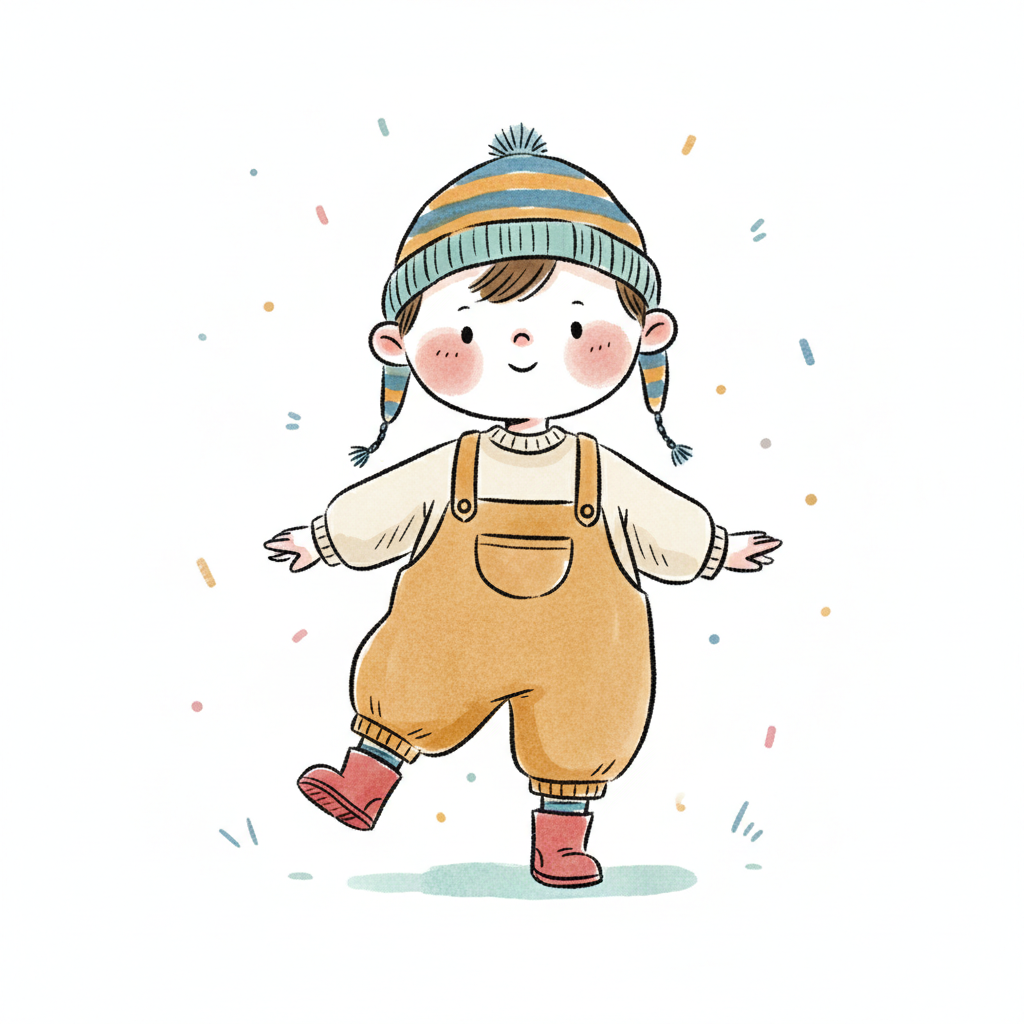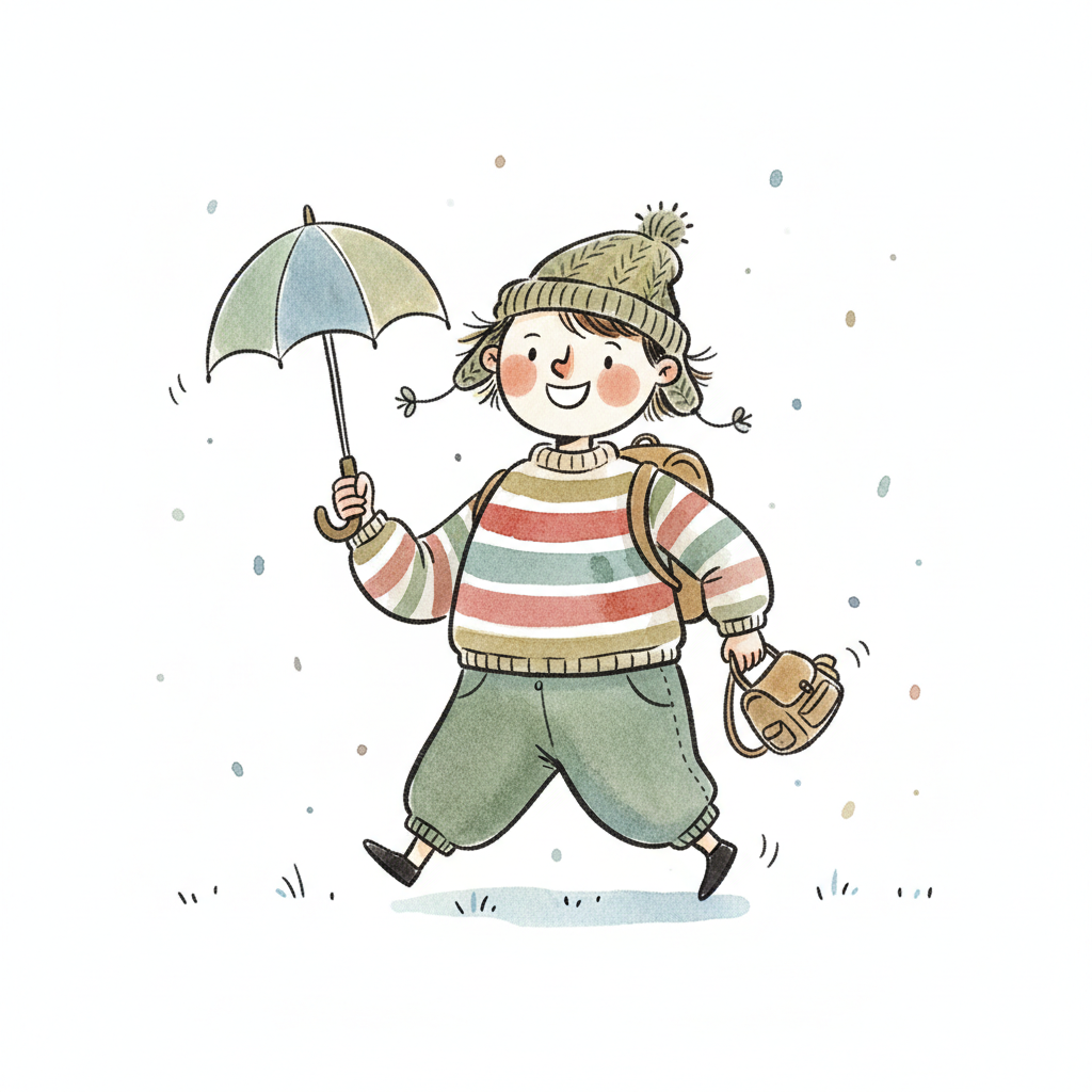 Niedliche, kindgerecht illustrierte Szene mit einem Kind oder einer Person als Hauptfigur, vor rein weißem Hintergrund, im frech-nordischen Aquarell-Skizzenstil. Klare, leicht wackelige Tuschekonturen, sichtbare Pinsel- und Strichtextur, dezente Schraffuren, weiche handgemalte Farbflächen in gedeckten Farben. Einfache, runde Formen. Keine harten Schatten, sondern sanfte, transparente Aquarellschichten. Leicht raue, handgezeichnete Linien statt glatter Vektorkanten. Subtile, vereinzelte Kritzelpunkte oder kleine Details im Hintergrund (wie Pünktchen oder feine Striche), aber keine echte Umgebung oder Landschaft. Die Figur ist mittig zentriert. Insgesamt charmant, humorvoll, warm und handgemacht wirkend. WICHTIG: Das Bild darf ABSOLUT KEINEN TEXT, KEINE BUCHSTABEN und KEINE ZAHLEN enthalten.