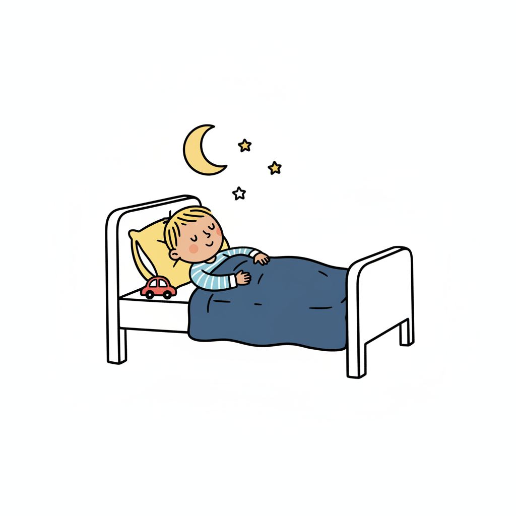 Ein schlafendes Kind im Bett mit einem Auto und einem Mond.