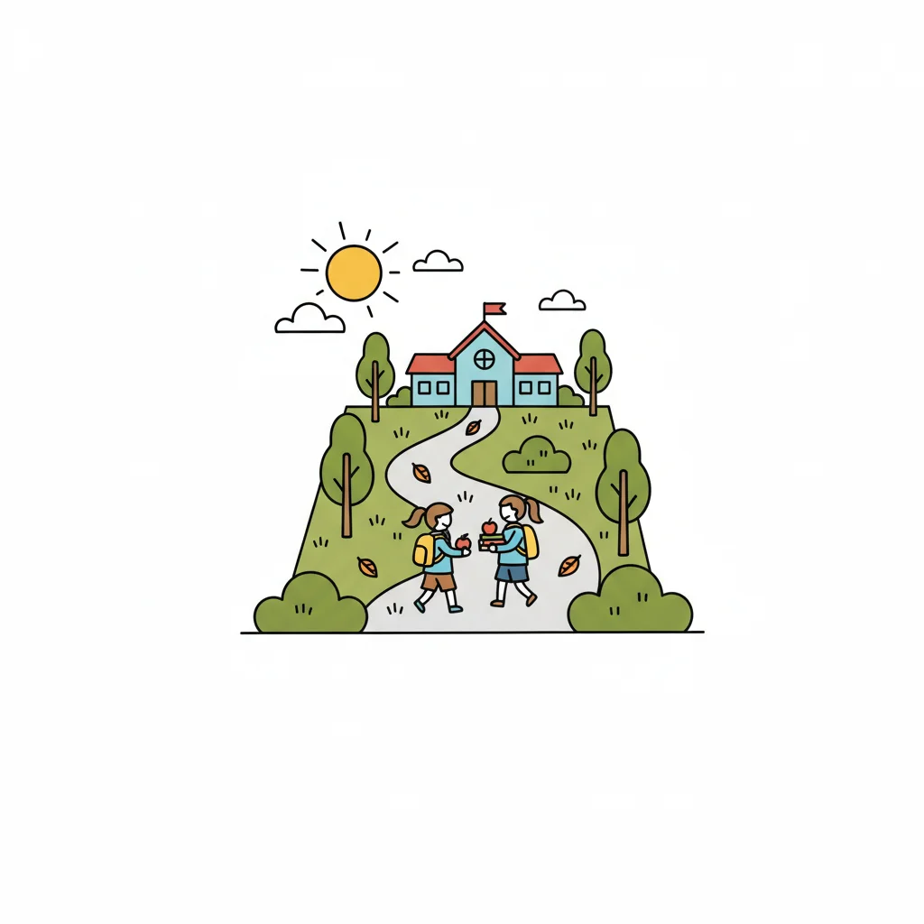 Zwei Kinder gehen fröhlich zur Schule unter sonnigem Himmel.