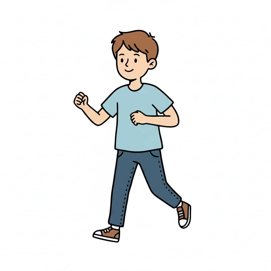 Ein junger Junge geht fröhlich mit einem Lächeln.