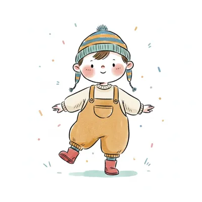 Ein fröhliches Kind in Latzhose und Mütze, umgeben von bunten Konfetti.
