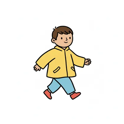 Ein Junge in gelbem Regenmantel läuft fröhlich.