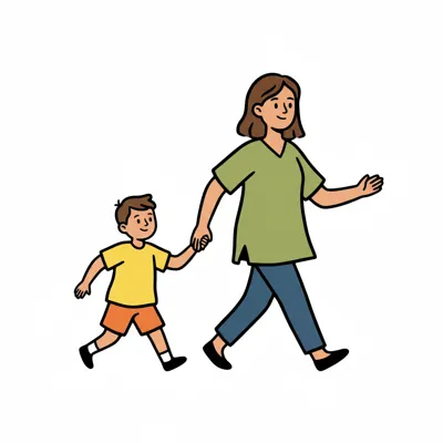 Eine Mutter und ihr Sohn gehen Hand in Hand.