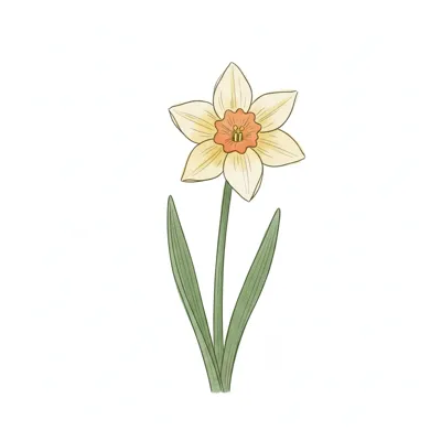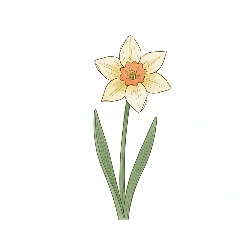 Eine gelbe Narzisse mit grünen Blättern auf weißem Hintergrund.