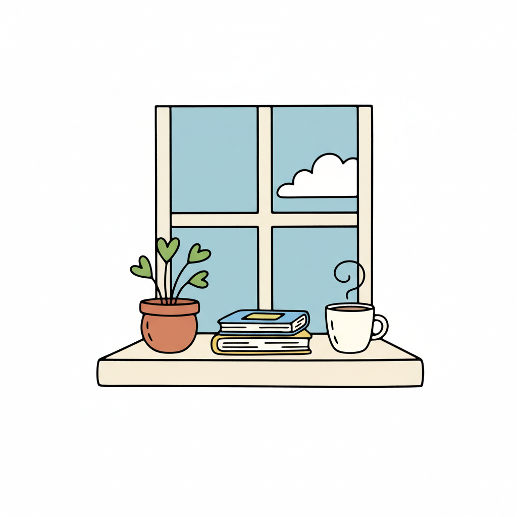 Fensterbank mit Pflanze, Büchern und einer Tasse Kaffee.