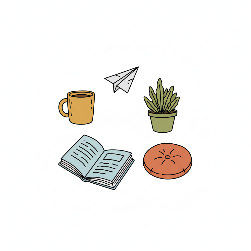 Ein gemütliches Arrangement mit Tasse, Buch, Pflanze und Flughafenpapierflieger.