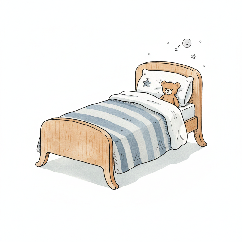 Ein gemütliches Kinderbett mit einem Teddybären und Sternen über dem Kopf.