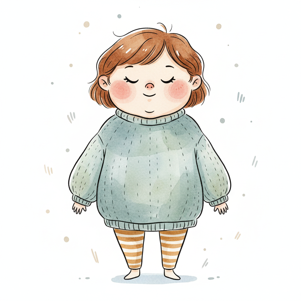 Niedliche, kindgerecht illustrierte Szene mit einem Kind oder einer Person als Hauptfigur, vor rein weißem Hintergrund, im frech-nordischen Aquarell-Skizzenstil. Klare, leicht wackelige Tuschekonturen, sichtbare Pinsel- und Strichtextur, dezente Schraffuren, weiche handgemalte Farbflächen in gedeckten Farben. Einfache, runde Formen. Keine harten Schatten, sondern sanfte, transparente Aquarellschichten. Leicht raue, handgezeichnete Linien statt glatter Vektorkanten. Subtile, vereinzelte Kritzelpunkte oder kleine Details im Hintergrund (wie Pünktchen oder feine Striche), aber keine echte Umgebung oder Landschaft. Die Figur ist mittig zentriert. Insgesamt charmant, humorvoll, warm und handgemacht wirkend. WICHTIG: Das Bild darf ABSOLUT KEINEN TEXT, KEINE BUCHSTABEN und KEINE ZAHLEN enthalten.