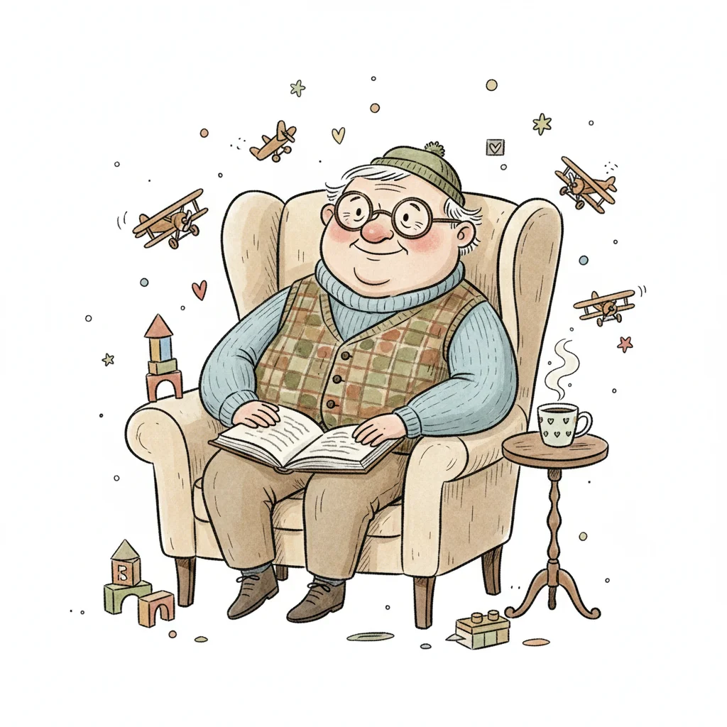 Älterer Mann in Sessel, liest ein Buch, umgeben von Spielzeugen und einer Tasse Kaffee.