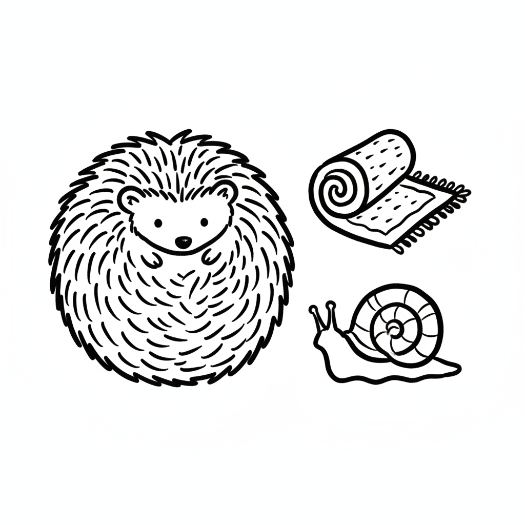 Schwarz-weiße Illustration von Igel, aufgerolltem Teppich und Schnecke.