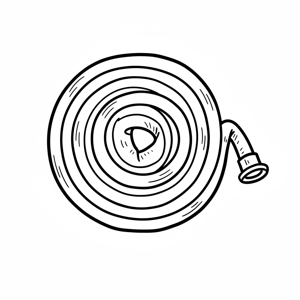 Schwarz-weiße Skizze eines aufgerollten Gartenschlauchs mit Anschlussstück.