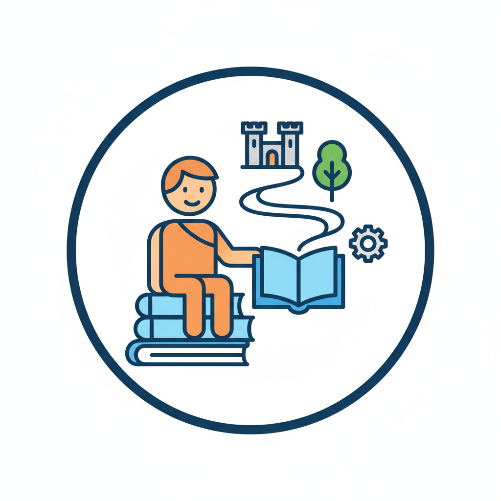 Person sitzt auf Büchern, liest. Aus dem Buch entspringen Schloss, Baum und Zahnrad – Wissen und Fantasie.