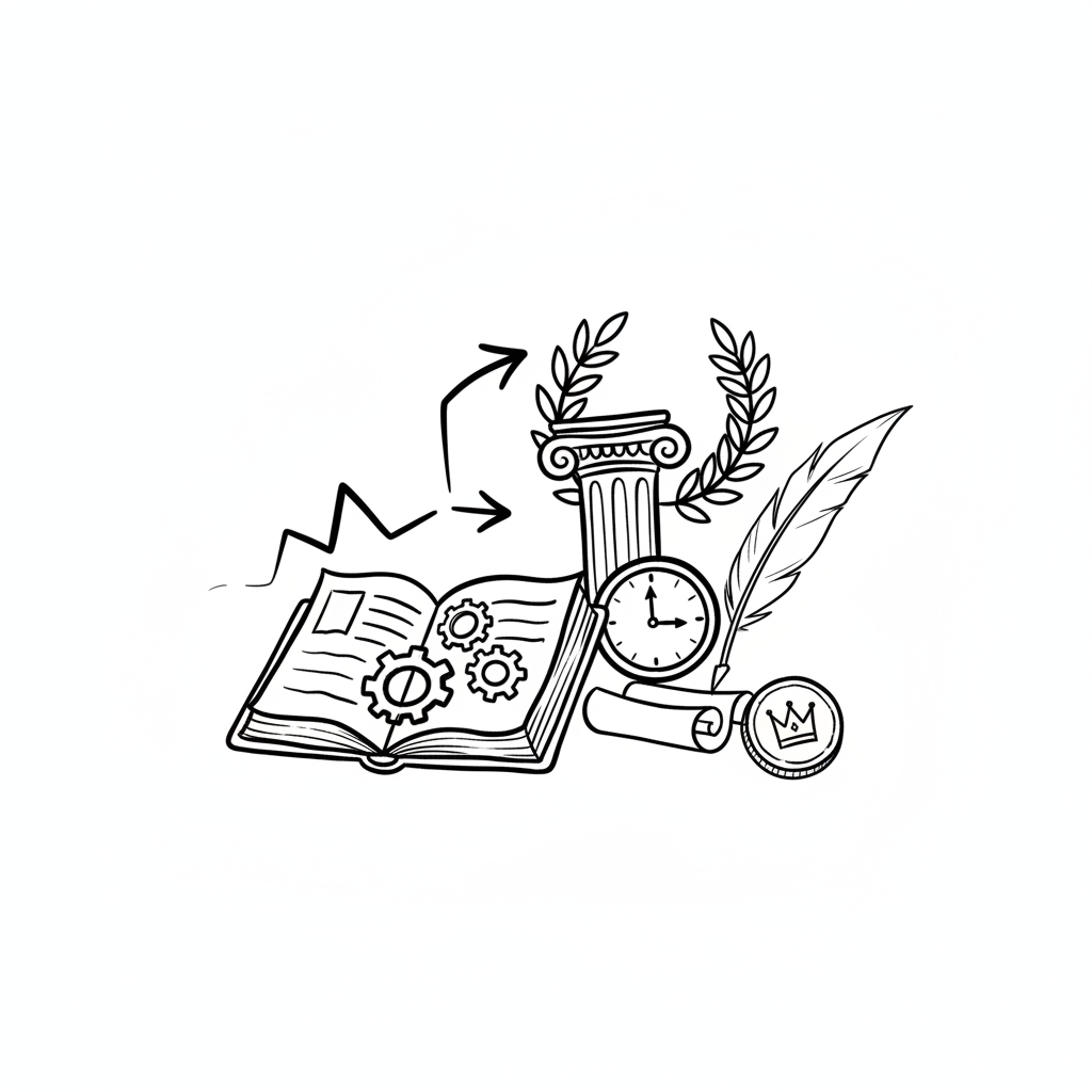 Handgezeichnete Symbole für Wissen, Geschichte und Fortschritt: Buch, Säule, Uhr, Feder, Münze.