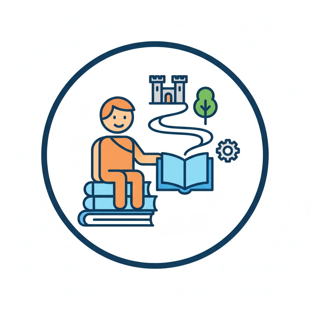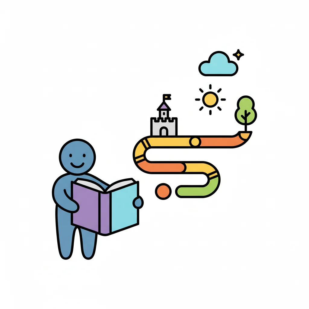 Figur liest Buch, aus dem eine Fantasiewelt mit Schloss und Weg entspringt.