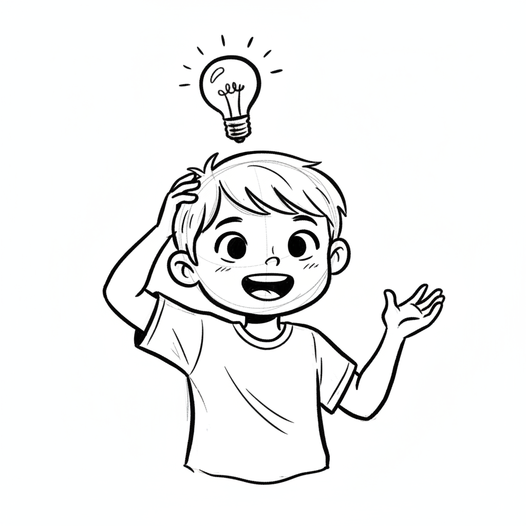 Ein fröhlicher Junge hat eine Idee, dargestellt durch eine Glühbirne über seinem Kopf.