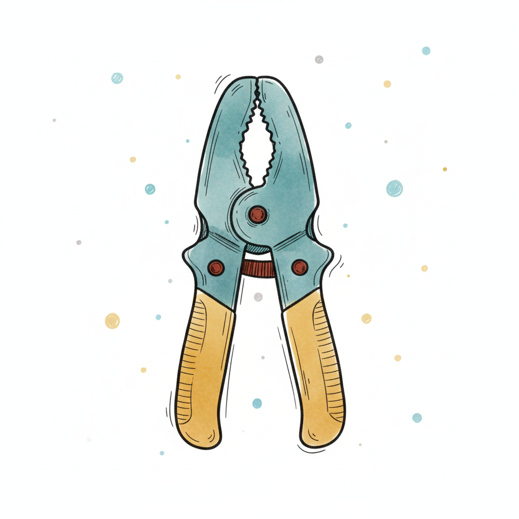 Aquarell-Illustration einer blauen Zange mit gelben Griffen auf weißem Hintergrund.
