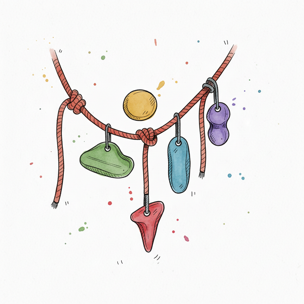 Bunte Klettergriffe hängen an einem roten Seil, illustriert mit Aquarellspritzern.