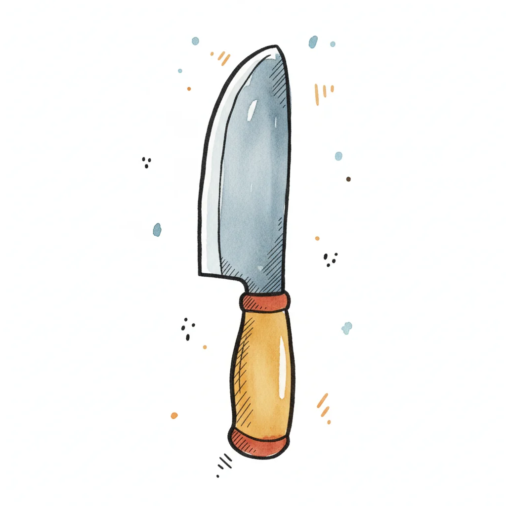 Handgezeichnetes Küchenmesser mit silberner Klinge und braunem Griff auf weißem Hintergrund.