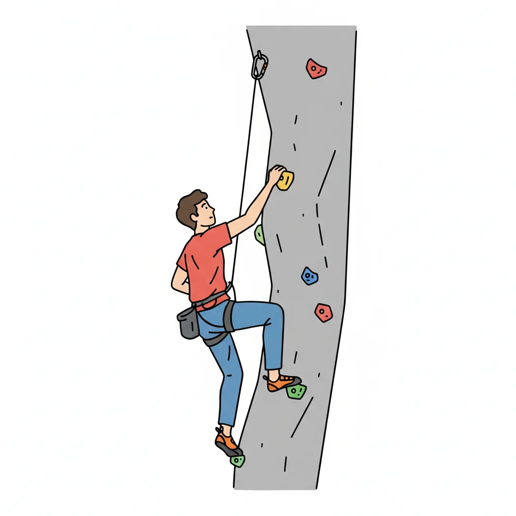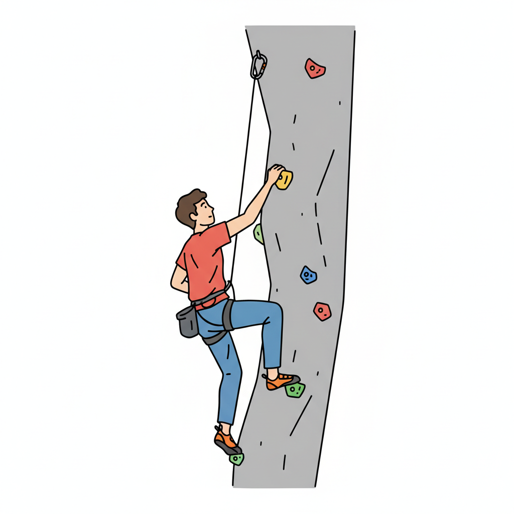 Illustration eines Mannes beim Klettern an einer Kletterwand mit Seil und bunten Griffen.