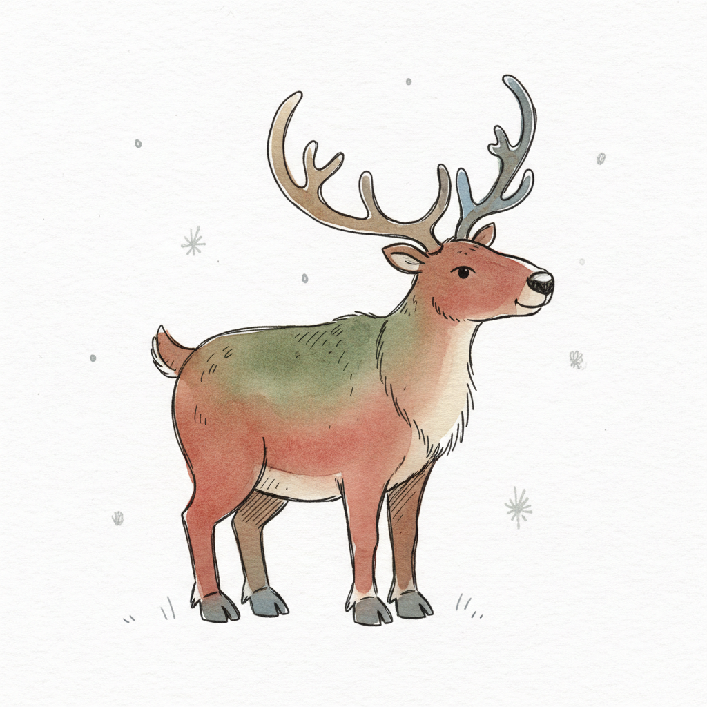 Niedliche Aquarell-Illustration eines Rentiers mit großem Geweih im Schnee.