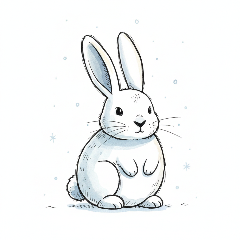 Niedliche Illustration eines weißen Hasen mit großen Ohren, umgeben von kleinen Schneeflocken.