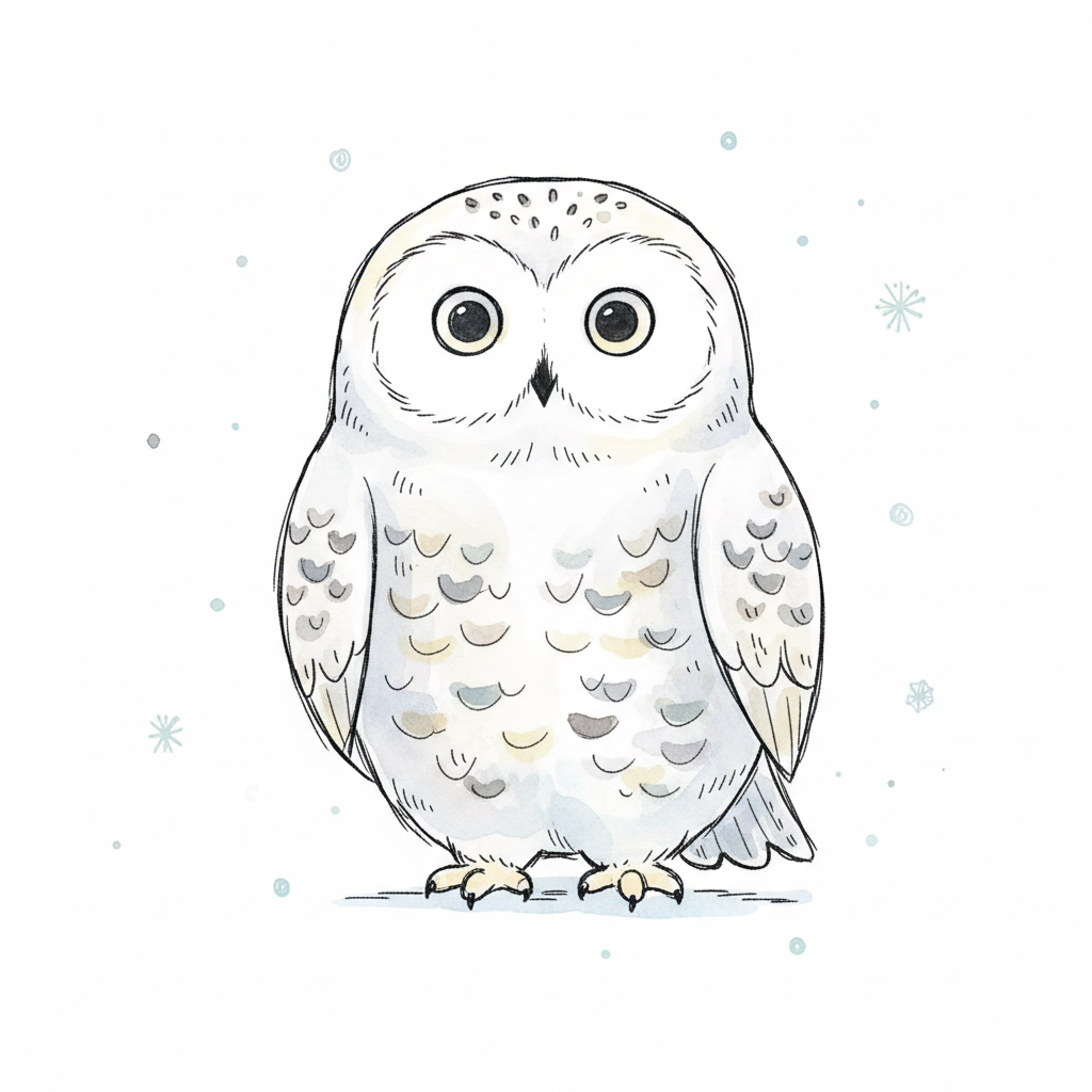 Süße, gezeichnete Schneeeule mit großen Augen und zarten Schneeflocken im Hintergrund.