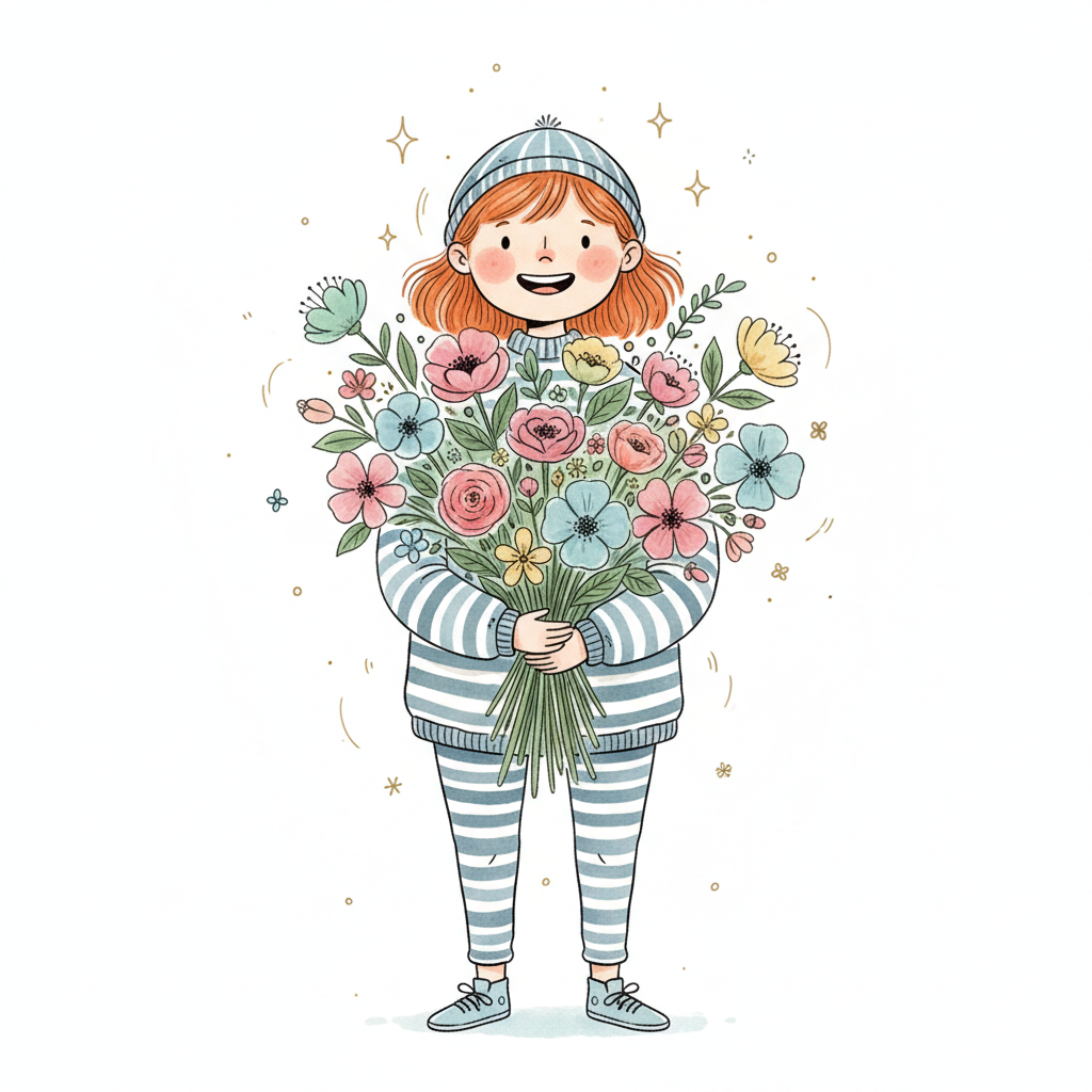 Fröhliches Mädchen mit rotem Haar und gestreifter Kleidung hält einen großen, bunten Blumenstrauß.