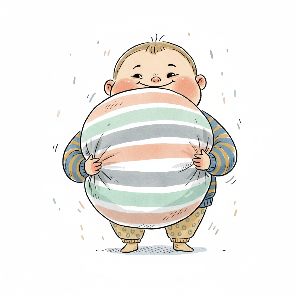 Ein niedliches, pummeliges Baby hält lächelnd ein großes, gestreiftes Kissen.