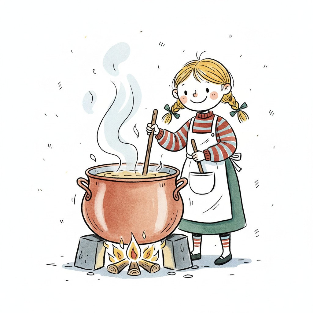 Fröhliches Mädchen rührt in einem großen Topf über einem Lagerfeuer, Dampf steigt auf.
