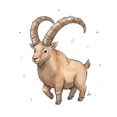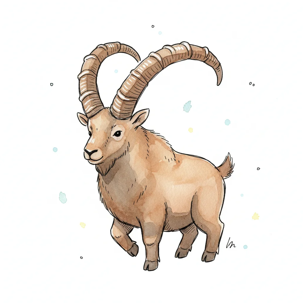 Aquarell-Illustration eines Steinbocks mit großen Hörnern auf weißem Hintergrund.
