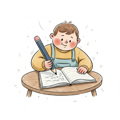 Fröhliches Kind in Cartoon-Stil schreibt mit großem Bleistift in ein Notizbuch.