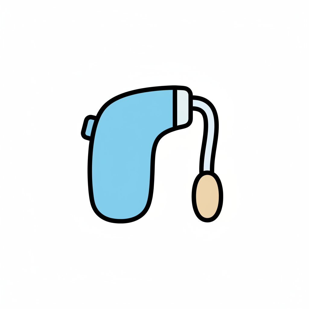 Eine einfache, cartoonartige Illustration eines hellblauen Hörgeräts mit Ohrpassstück.