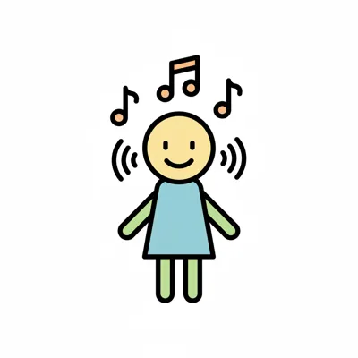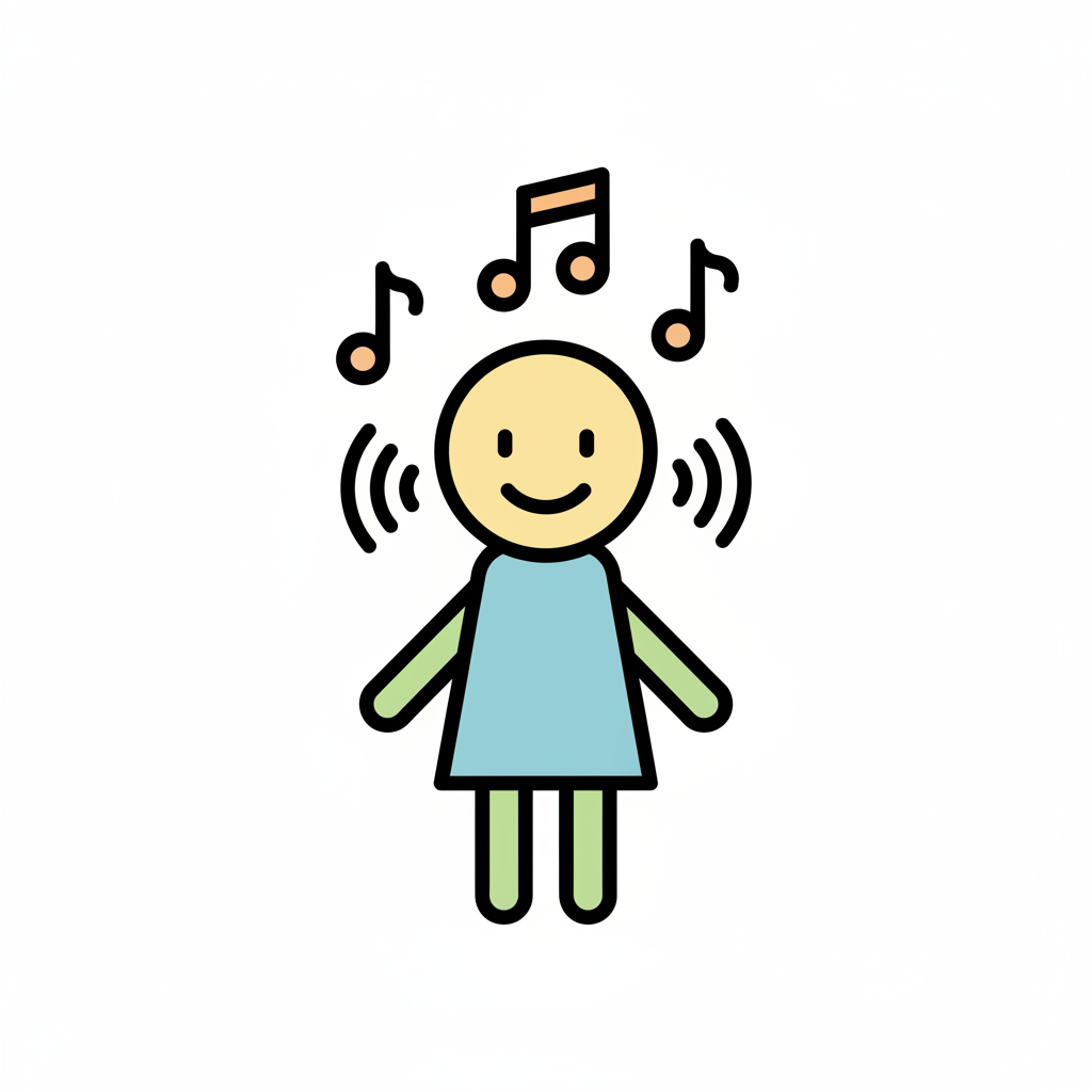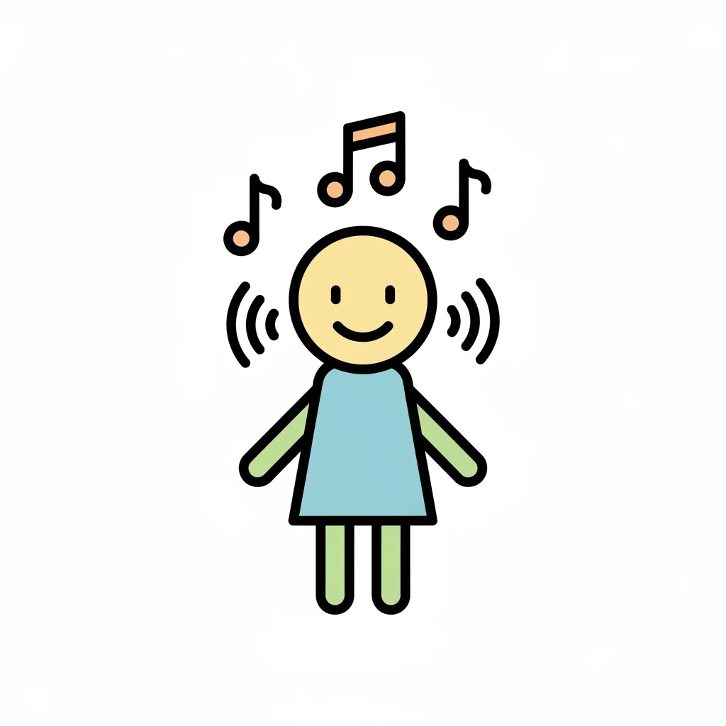 Fröhliche Person hört Musik, dargestellt mit Noten und Schallwellen um den Kopf.