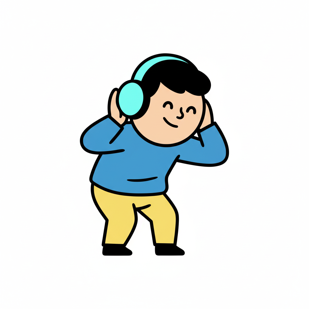 Fröhliche Cartoonfigur mit blauen Kopfhörern, die lächelnd Musik genießt.