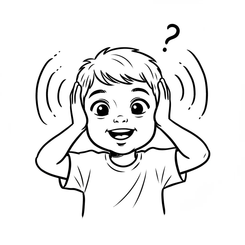 Junge hält sich die Ohren zu, mit Fragezeichen über dem Kopf, lauscht oder ist verwirrt.