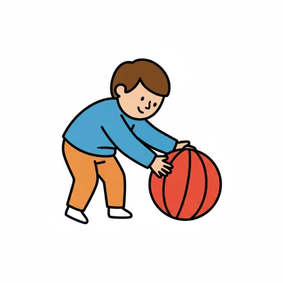 Ein fröhlicher Junge im Cartoon-Stil bückt sich und spielt mit einem roten Ball.