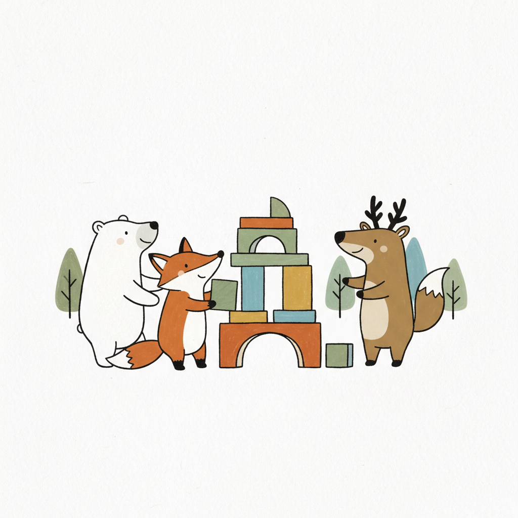 Niedliche Cartoon-Tiere (Bär, Fuchs, Hirsch) bauen gemeinsam einen Turm aus Holzklötzen.