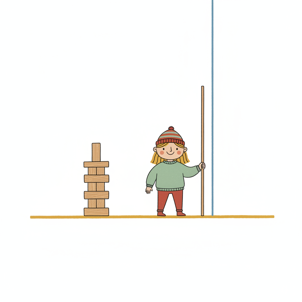 Ein lächelndes Kind mit Mütze hält einen Stock neben einem Turm aus Holzklötzen.