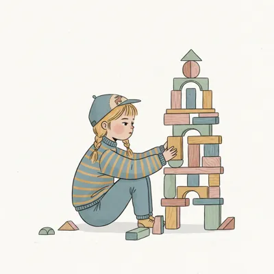 Ein Kind baut einen Turm aus bunten Holzklötzen und platziert eine Wolke obenauf.