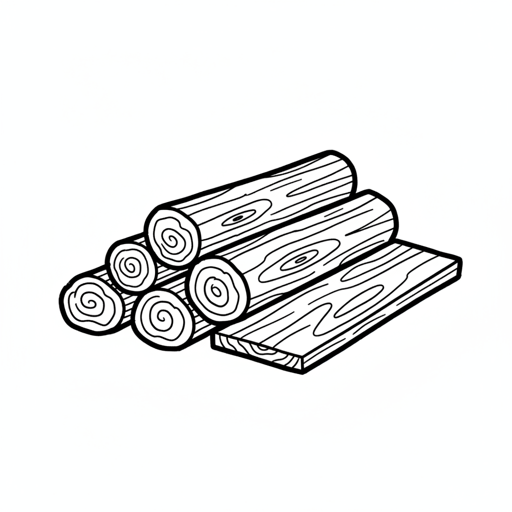 Schwarz-weiße Illustration von gestapelten Holzscheiten und einem Holzbrett mit Maserung.