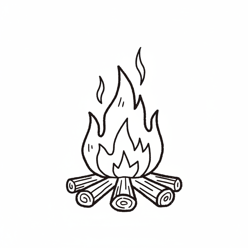 Schwarz-weiße Strichzeichnung eines Lagerfeuers mit Holzscheiten und Flammen.