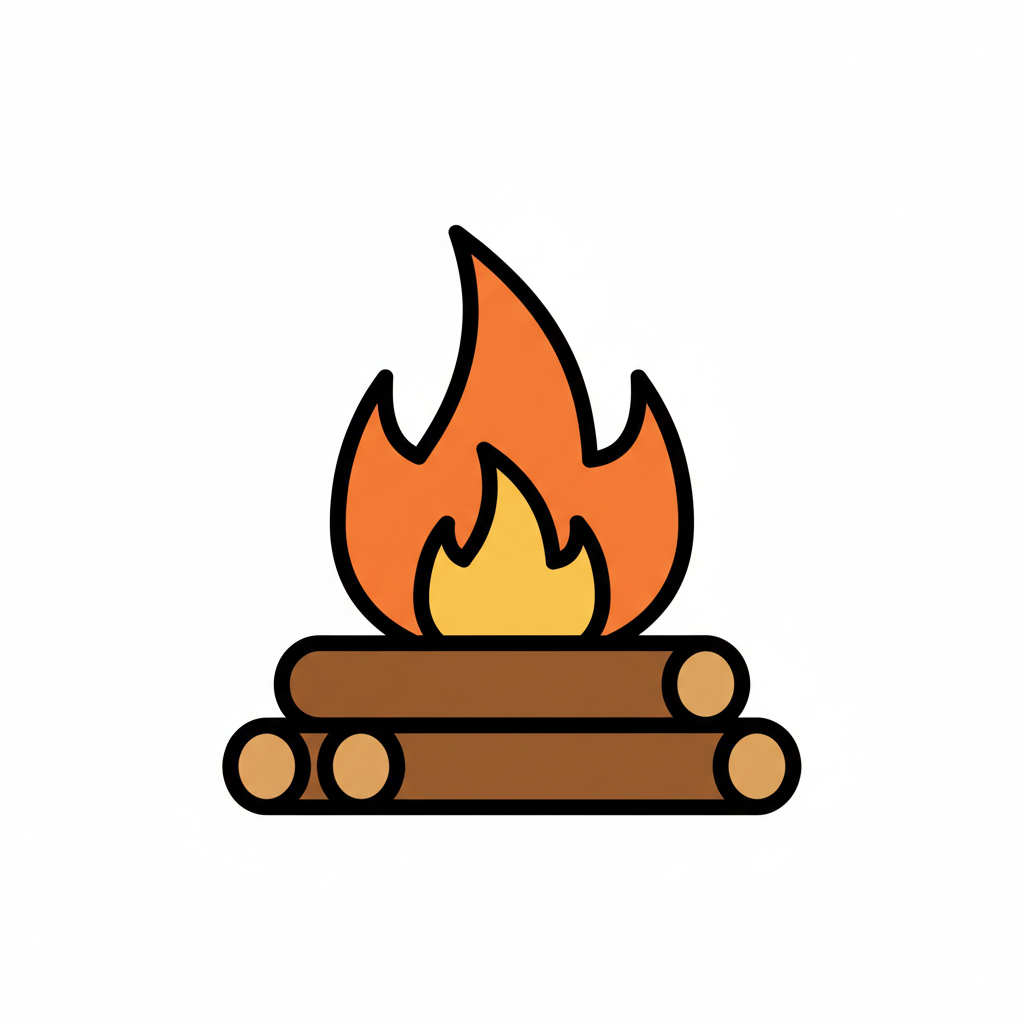 Buntes Icon eines Lagerfeuers mit orange-gelben Flammen über braunen Holzscheiten.