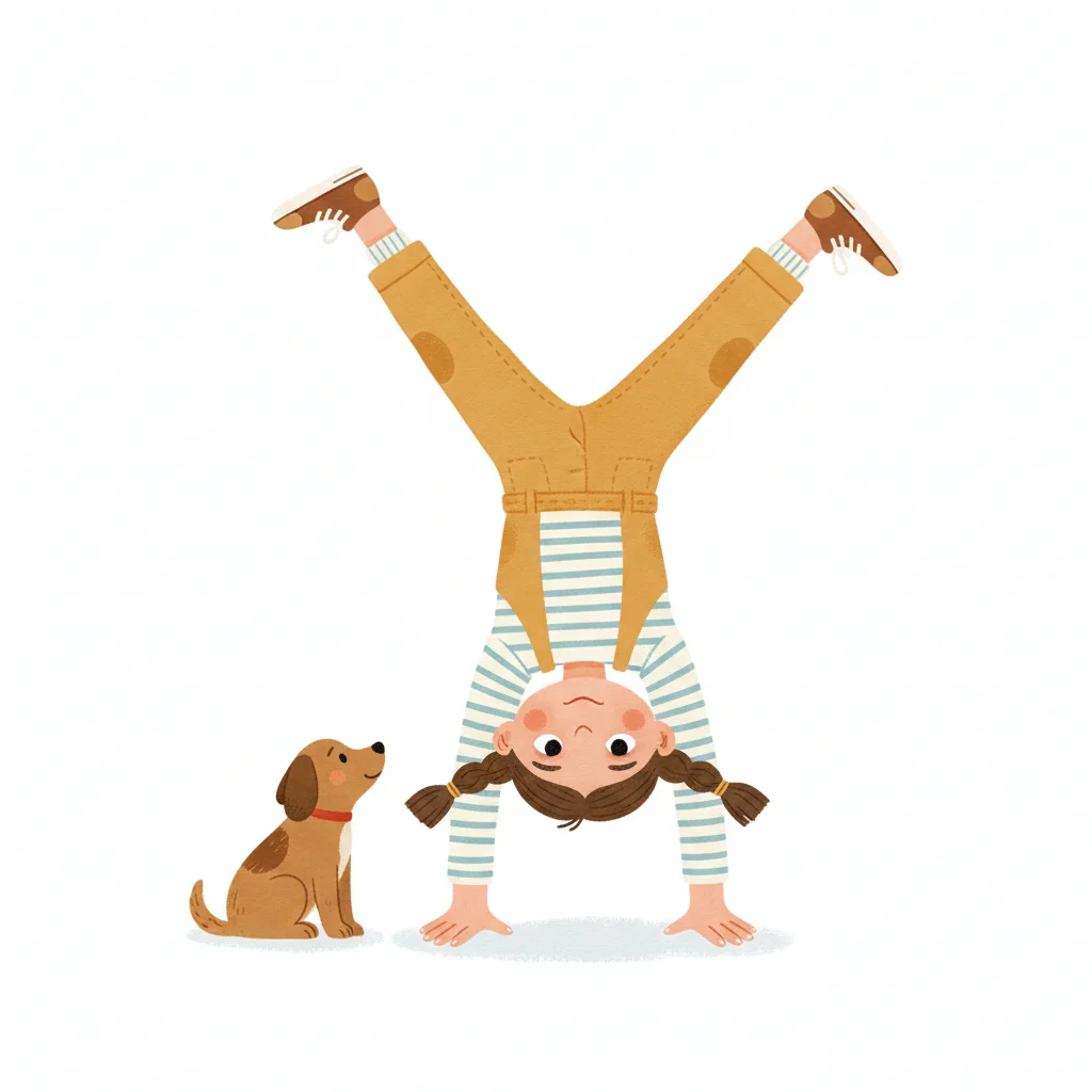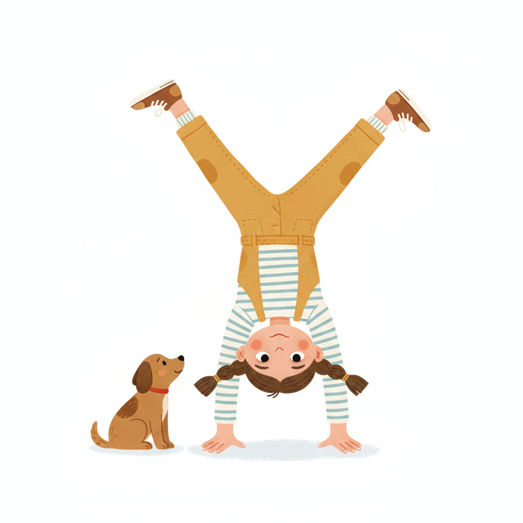 Mädchen macht einen Handstand neben einem Hund.
