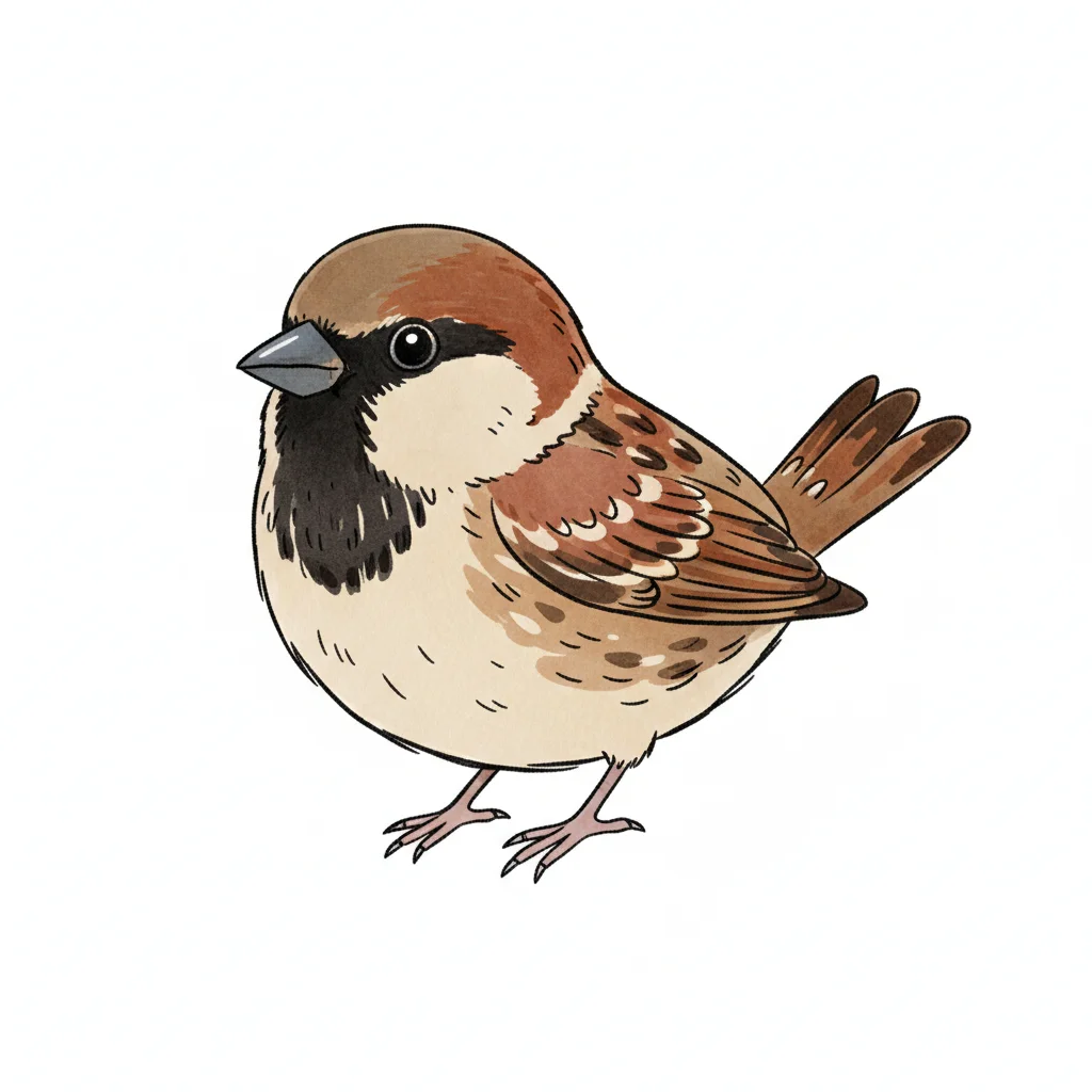 Ein illustrierter Spatz mit braunem Gefieder und kurzer Schnauze.