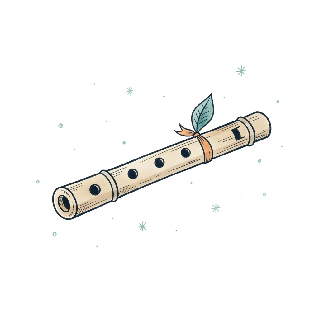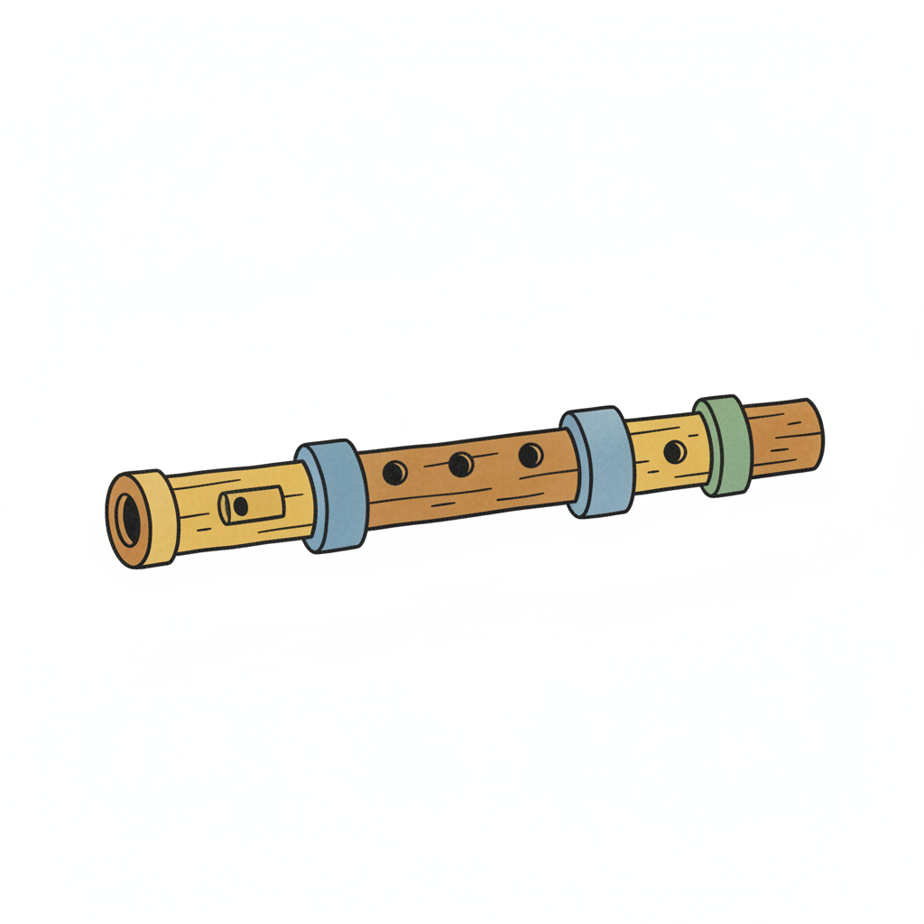 Cartoon-Zeichnung einer braunen Holzflöte mit blauen und grünen Bändern und Löchern.