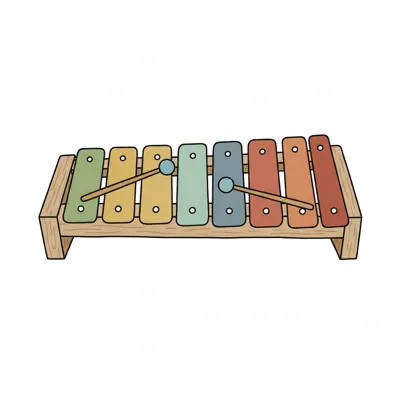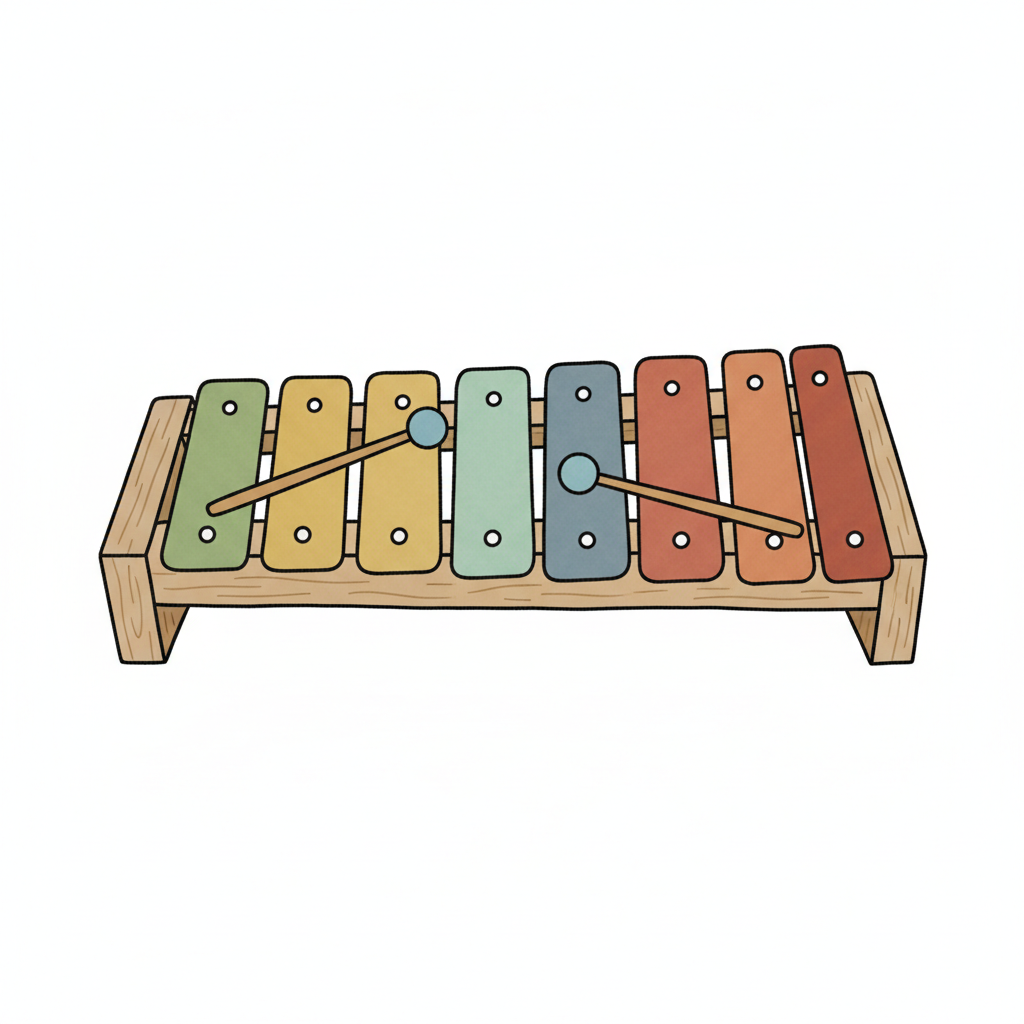 Buntes Xylophon mit Schlägeln im Cartoon-Stil auf weißem Hintergrund.